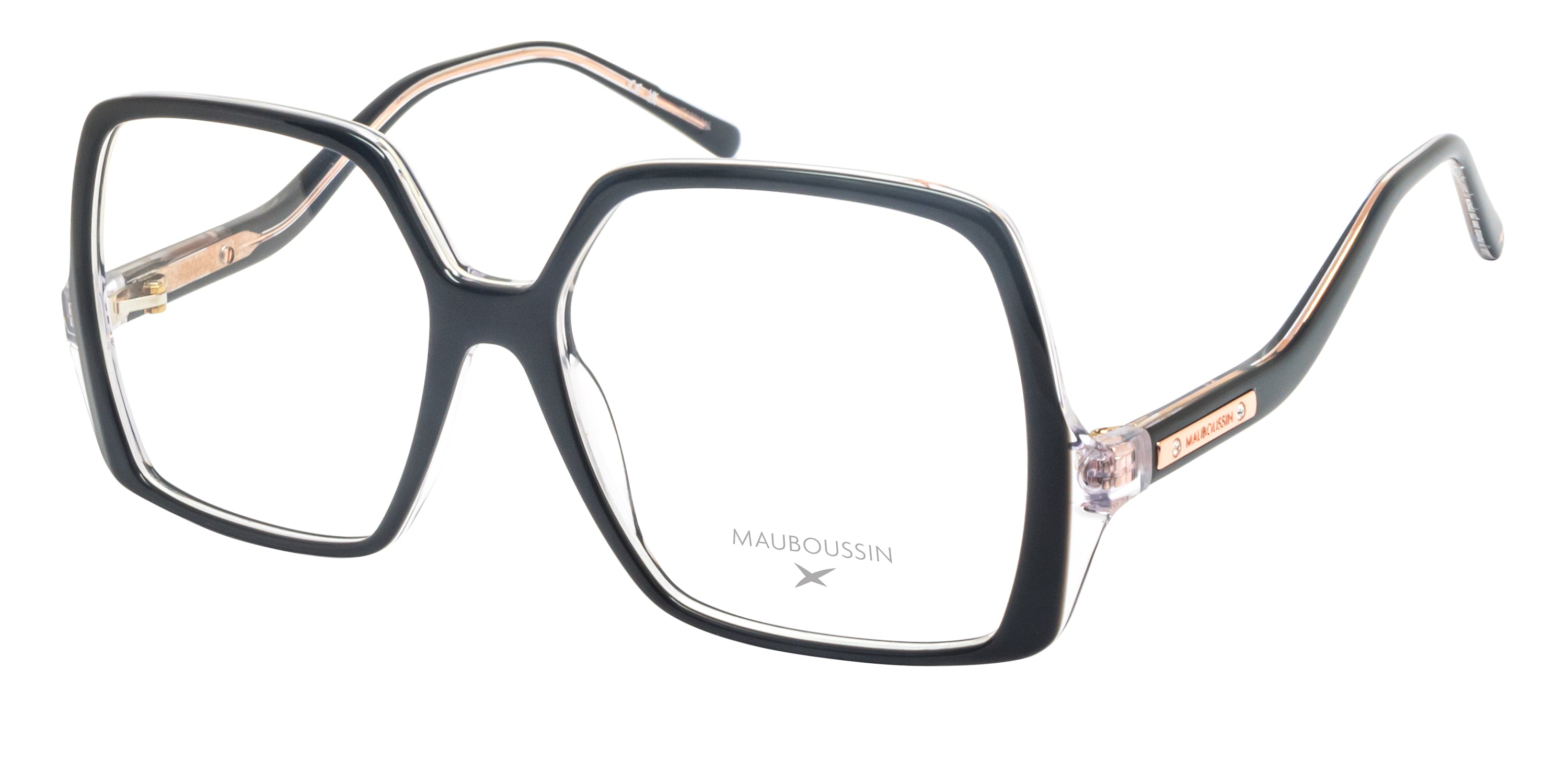 La monture en acétate noir profond, rehaussée de subtils détails transparents et d’inserts doré rose, crée un contraste raffiné et moderne. Les branches sculptées intègrent la signature Mauboussin, soulignant l’inspiration joaillière emblématique de la maison.